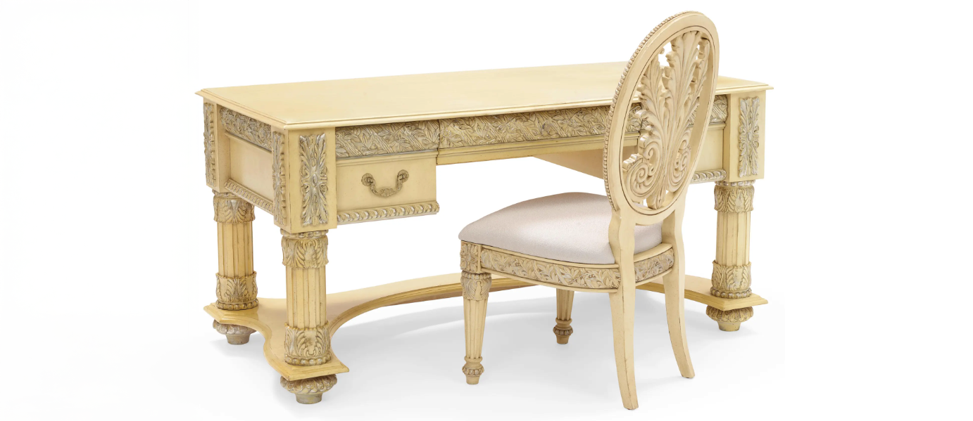 Late 20th CenturyA Richard Simmons Italian Baroque–Style Parcel-Silvered and Painted Personal Desk and Chair Straight from Richard Simmons’s own office! This ornate desk and chair weren’t just décor — they were Richard’s daily stage for…