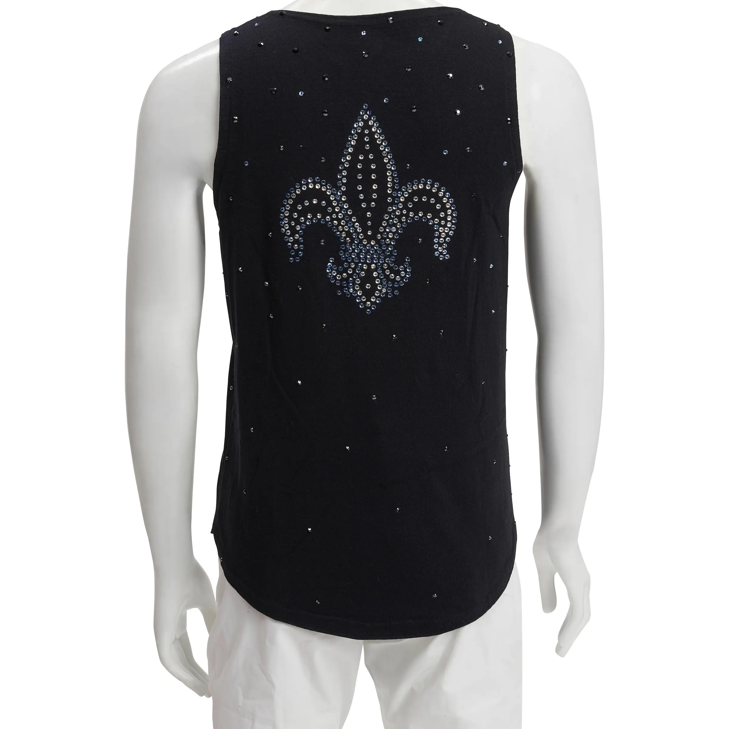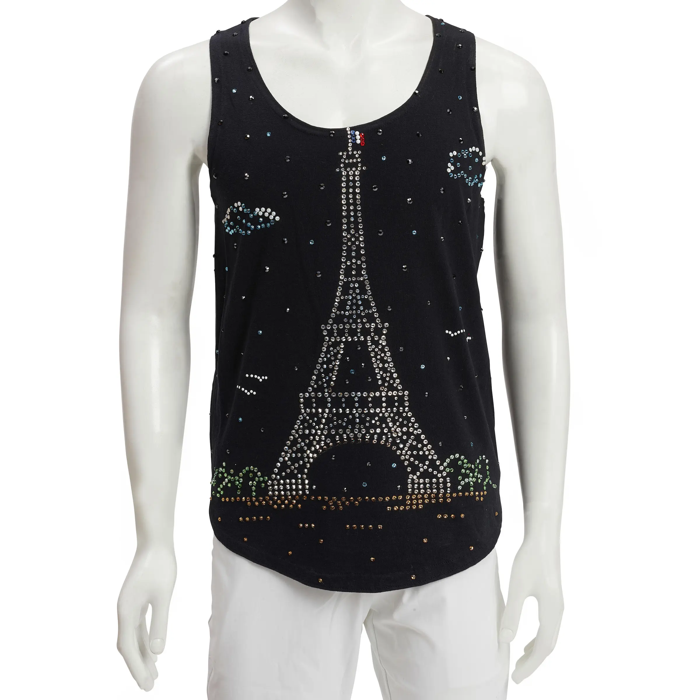 black cotton tank top with multitone Swarovski crystal embellishments of a Parisian scene with the Eiffel tower on the front and a fleur des lis on the back.