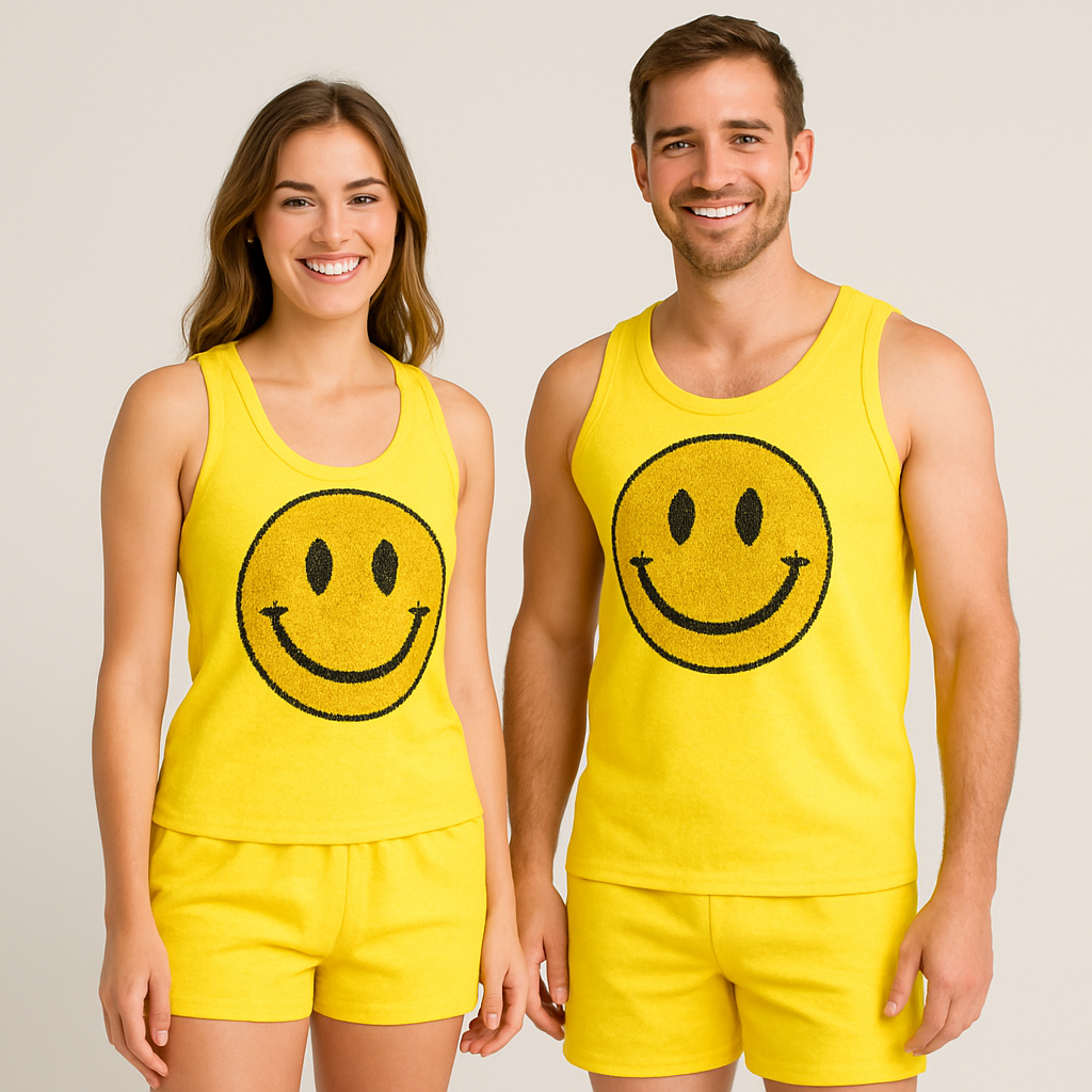 Female model → Yellow tank with large sequin smiley face + matching yellow shorts.